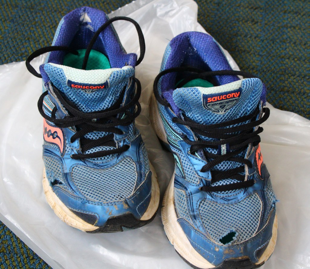 Most of my walks have been along the lakefront or in wooded areas. It feels good to take deep breaths of the fresh air. Unfortunately, the beach area was off limits shortly after the virus had reached our shore, so to speak. A few days prior to that I had started to collect “beach glass” with the intention of making a piece of art. (I learned of this craft from a friend in Nova Scotia who has made beautiful jewellery and pictures from “sea glass” that she collects along the seashore). Although my new interest was curtailed, I was happy that we were still allowed to walk through the park as long as social distancing was adhered to. My walks continued regularly for at least a month but the ‘old’ shoes were showing their “wear and tear.”