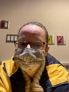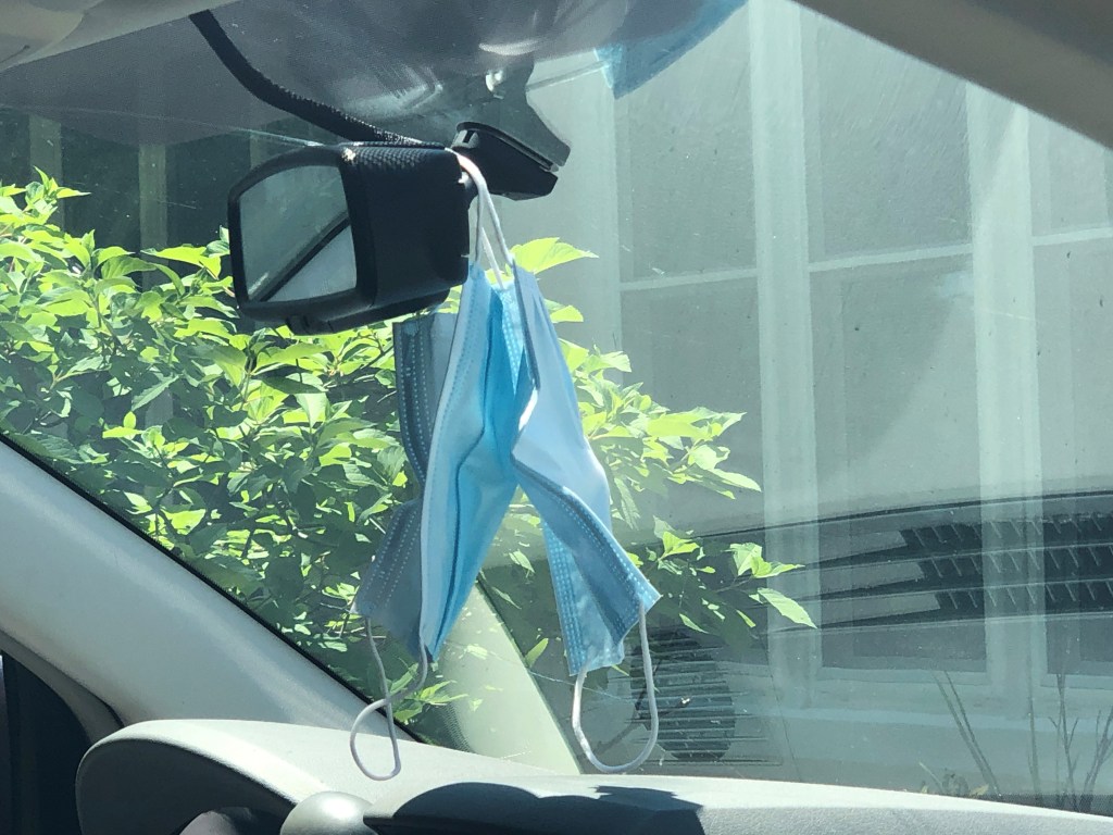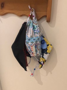 My growing collection of non-medical masks, which hang by the front door, ready to grab when I leave my house. The beads on the straps help these masks fit more securely on my face – a suggestion made by an employee at Oshawa’s Ultimate Sewing Centre! I was on the hunt for toggles and she recommended beads.