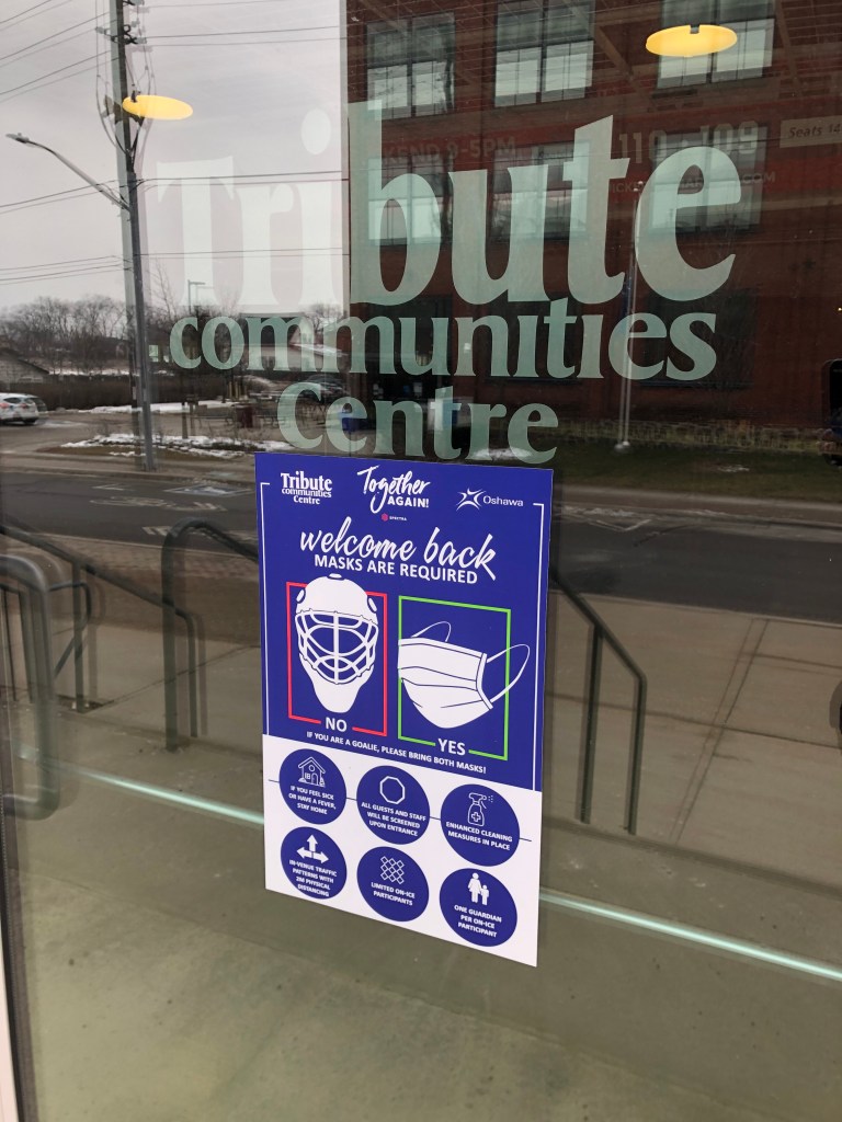 I am a sucker for good branding and creative marketing, and while walking around downtown, my attention was grabbed by the signage outside the Tribute Communities Centre (formerly, GM Centre). This hockey rink is used by the Oshawa Generals (when they are in season) and by community groups for practice and play, and the clever signage, clarifying which masks are acceptable for entry was humorous and ‘on brand’ for the site and how the space is typically used.
