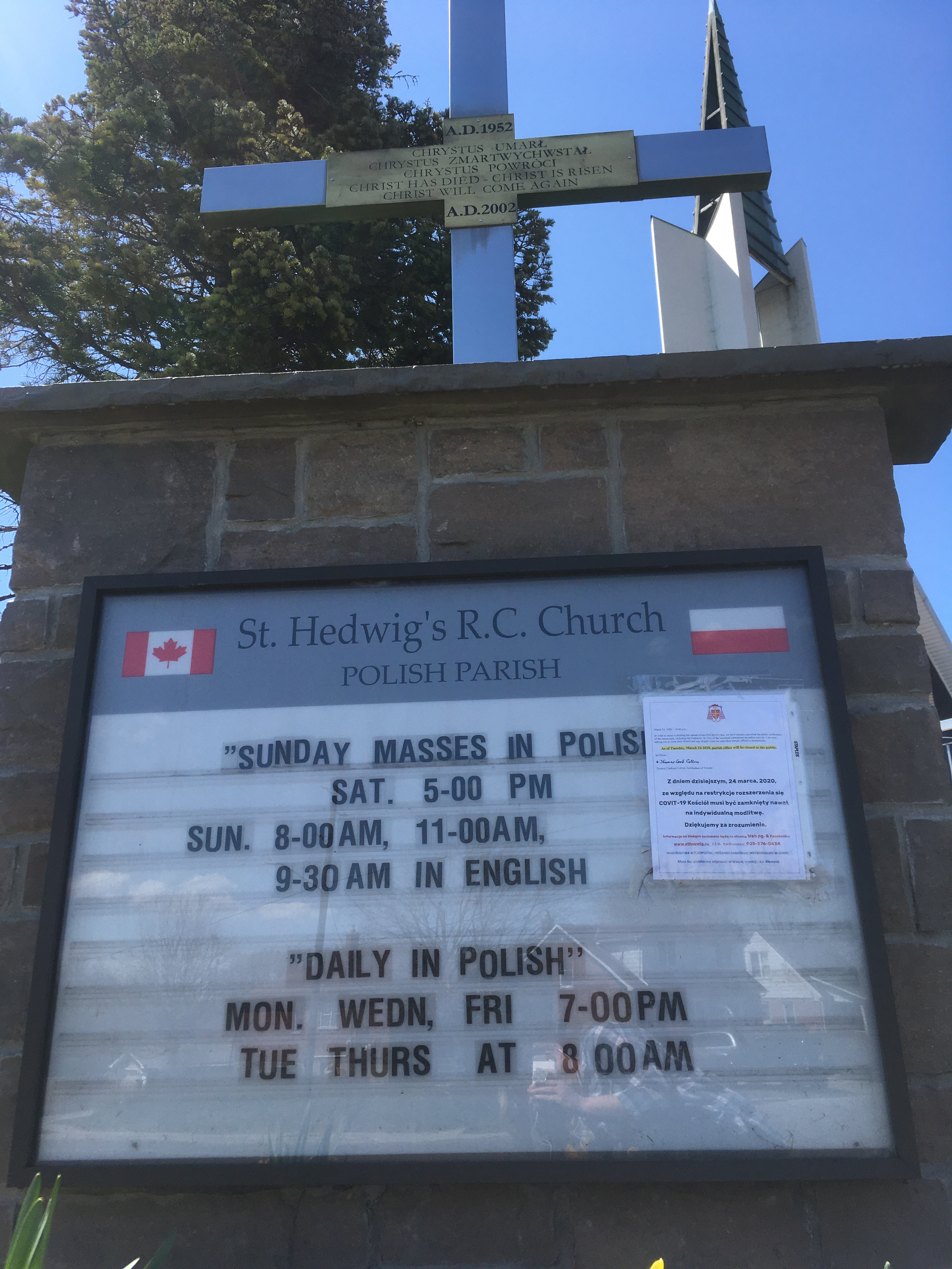 The printed sign taped to the larger sign has COVID-19 information on it, and it is also in English and Polish.