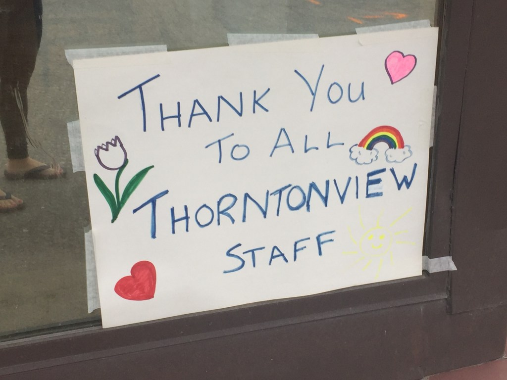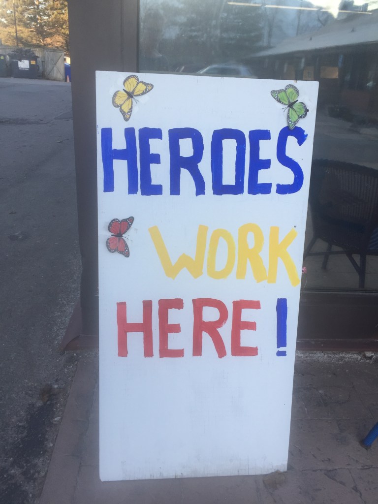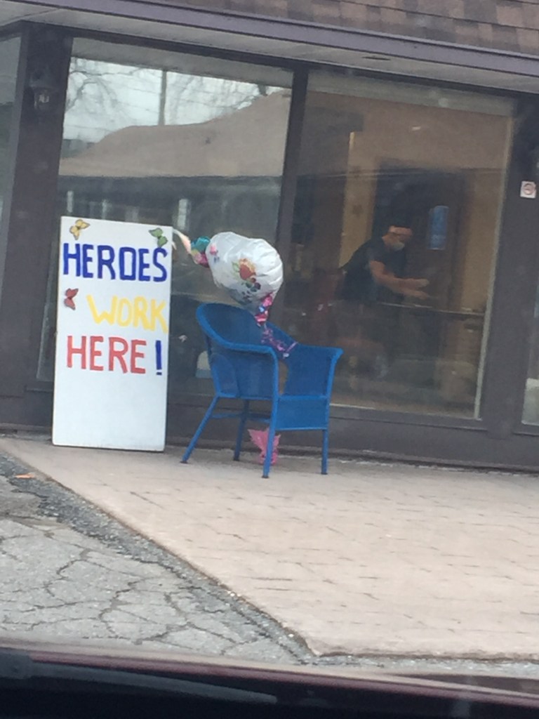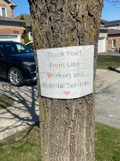 With the onset of nicer weather, we have also been able to spend more time together outside. The kids riding their bikes and my husband and I walking, all of us working together in the garden to get it ready for summer, and practicing soccer and catch. With these walks, I have been able to document some of the neighbourly solidarity and signage that has popped up in north Oshawa. There are many signs dedicated to frontline workers.