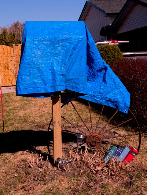 Today’s post is one of the more subtle images. Says Merle, “[This] is a neighbour’s lending library covered by the tarp. Not sure that is necessary but since the main libraries are closed, she followed suit.”