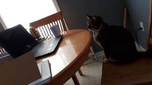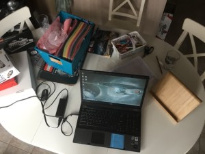 Until then, here are some photos of my workspaces at home – either my kitchen table, or my wait too comfortable chair and a half, usually accompanied by my cat Olaf.